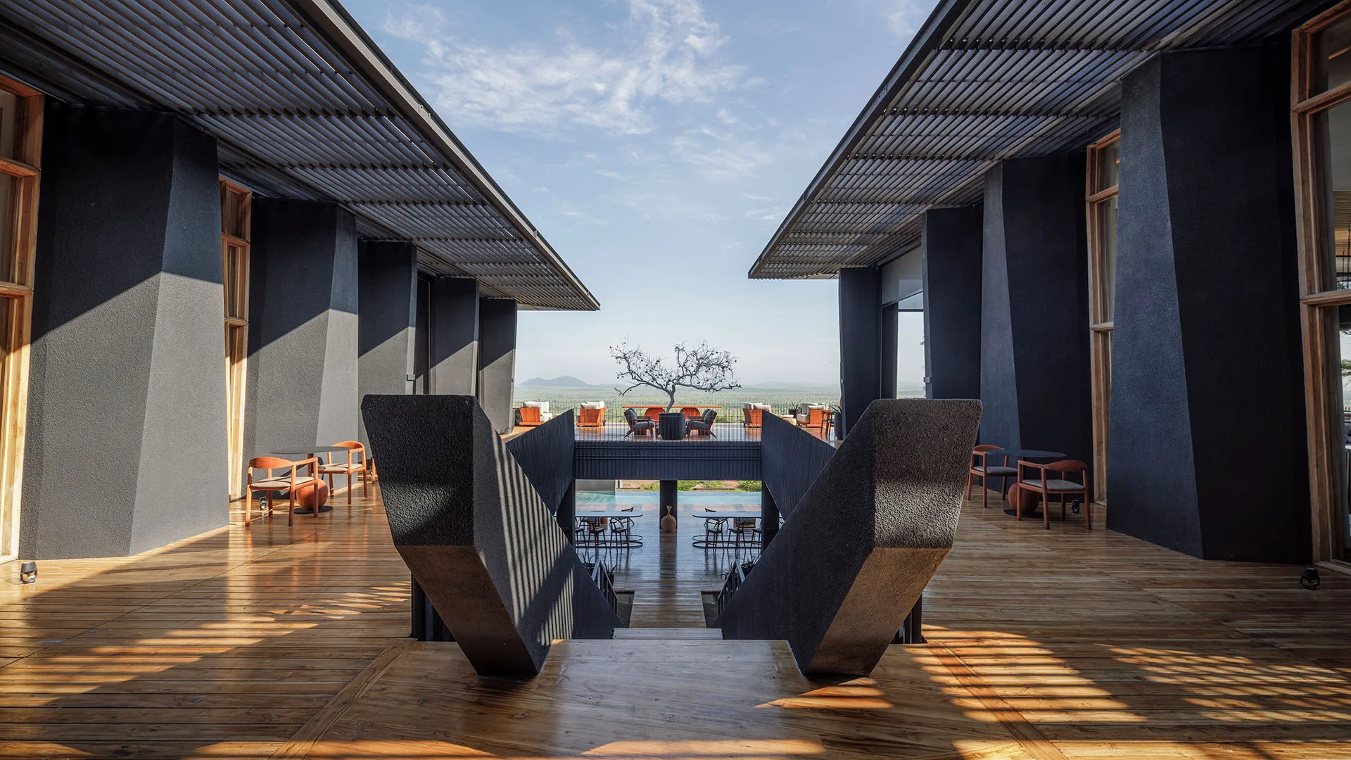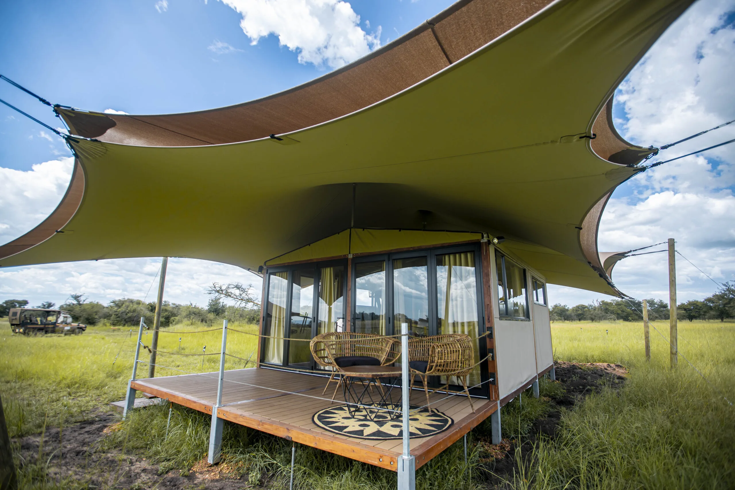 Tanzania safaris aren’t just about wildlife — where you stay is part of the experience too. Imagine relaxing on a terrace with a drink, looking out over the wide-open savannah — it’s a classic safari moment.